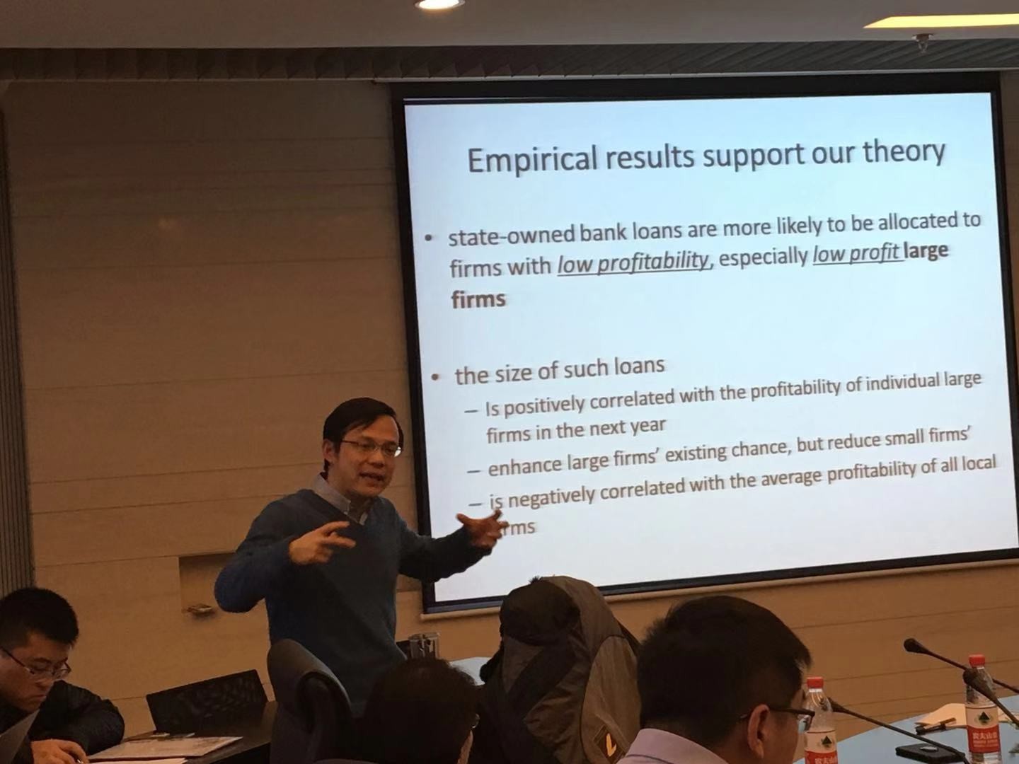 然后,钟教授对研究的实证检验部分进行了说明,包括数据的来源、回归检验的结果等。通过从一系列实证检验中得到的证据,钟老师基本验证了自己的猜想,即地方官员为了通过推动当地经济的发展来谋求政治晋升,往往会在其任期内促使辖区内的大型国有银行向当地的大企业提供更多的金融资源,使其进行更多的投资。这样的做法一方面会提升这些大企业的利润率水平,另一方面又通过影响高效率的中小企业对金融资源的可获得性,造成当地平均利润率的下降。