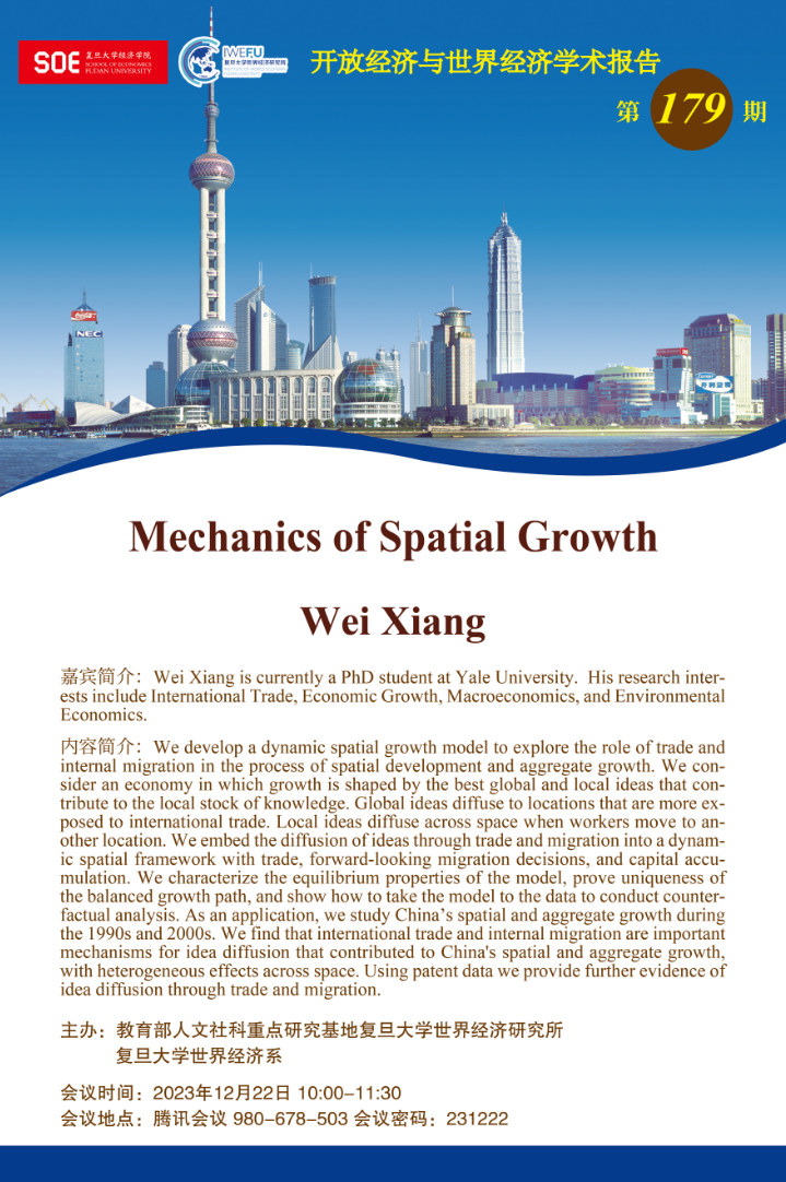 嘉宾简介:Wei Xiang is currently a PhD student at Yale University. His research interests include International Trade, Economic Growth, Macroeconomics, and Environmental Economics.