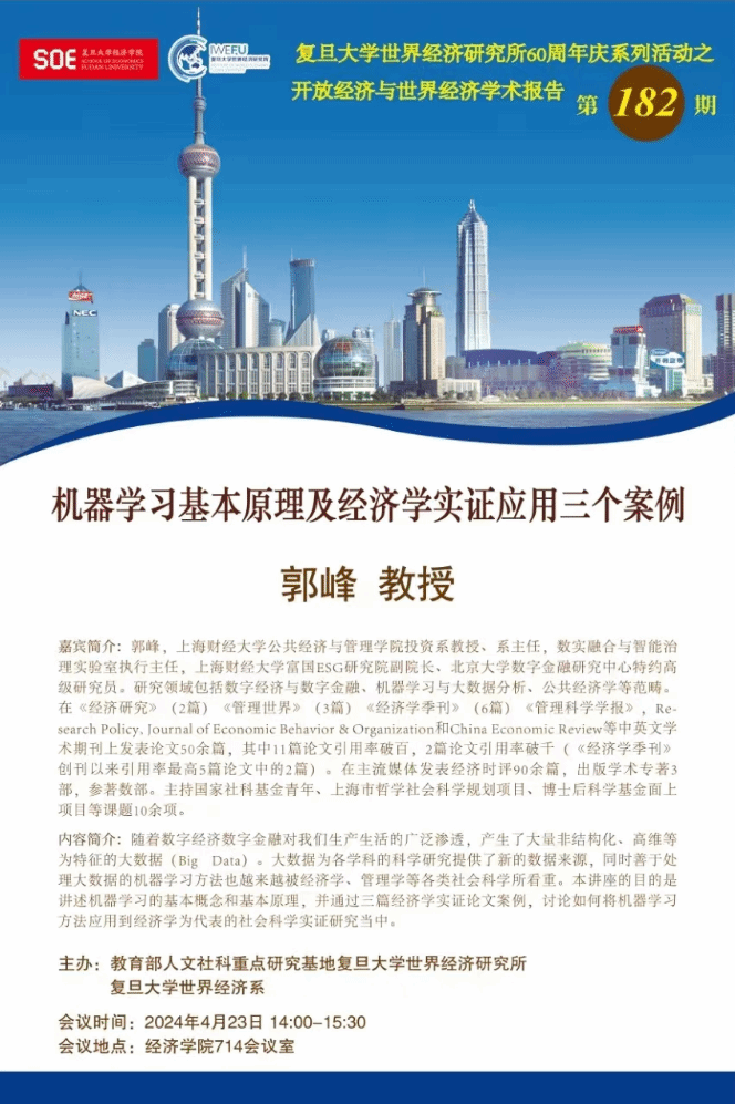个人简介:郭峰,上海财经大学公共经济与管理学院投资系教授、系主任,数实融合与智能治理实验室执行主任,上海财经大学富国ESG研究院副院长、北京大学数字金融研究中心特约高级研究员。研究领域包括数字经济与数字金融、机器学习与大数据分析、公共经济学等范畴。在《经济研究》(2篇)《管理世界》(3篇)《经济学季刊》(6篇)《管理科学学报》,Research Policy, Journal of Economic Behavior & Organization和China Economic Review等中英文学术期刊上发表论文50余篇,其中11篇论文引用率破百,2篇论文引用率破千(《经济学季刊》创刊以来引用率最高5篇论文中的2篇)。在主流媒体发表经济时评90余篇,出版学术专著3部,参著数部。主持国家社科基金青年、上海市哲学社会科学规划项目、博士后科学基金面上项目等课题10余项。