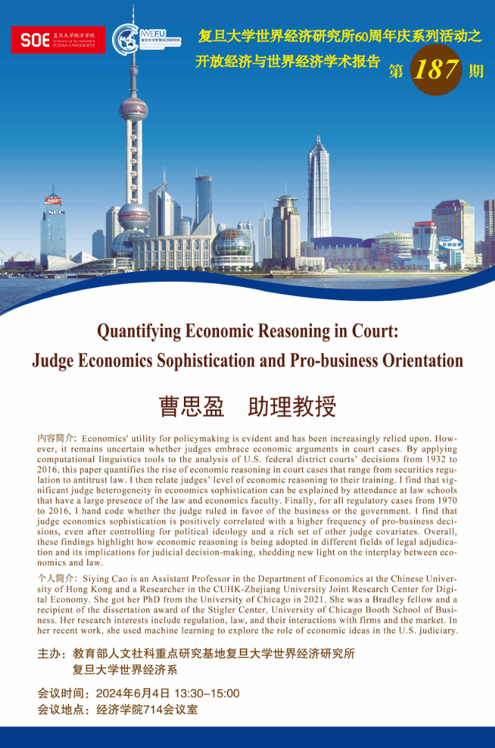 个人简介:Siying Cao is an Assistant Professor in the Department of Economics at the Chinese University of Hong Kong and a Researcher in the CUHK-Zhejiang University Joint Research Center for Digital Economy. She got her PhD from the University of Chicago in 2021. She was a Bradley fellow and a recipient of the dissertation award of the Stigler Center, University of Chicago Booth School of Business. Her research interests include regulation, law, and their interactions with firms and the market. In her recent work, she used machine learning to explore the role of economic ideas in the U.S. judiciary.