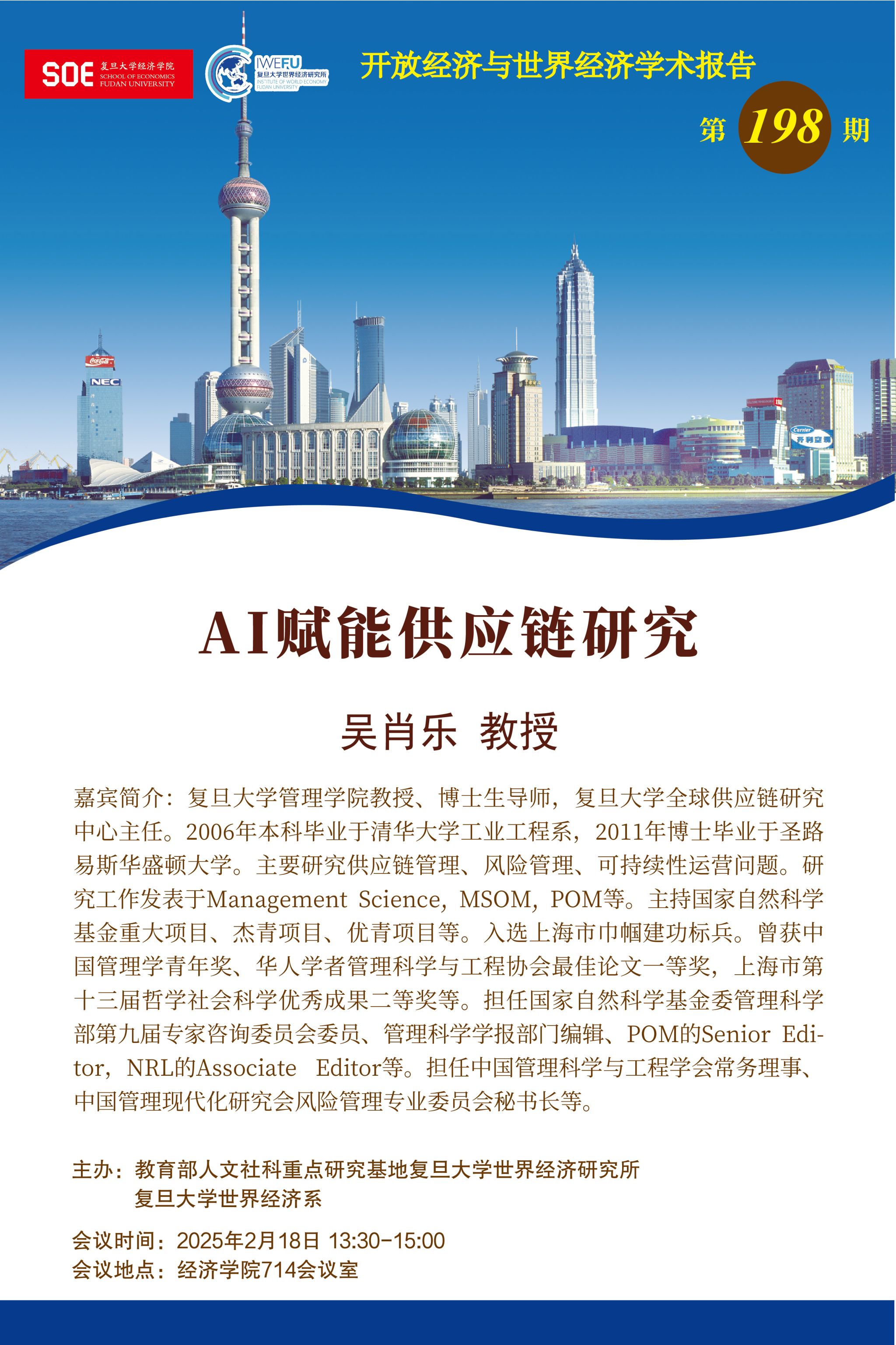 全球供应链研究中心主任。2006年本科毕业于清华大学工业工程系,2011年博士毕业于圣路易斯华盛顿大学。主要研究供应链管理、风险管理、可持续性运营问题。研究工作发表于Management Science, MSOM, POM等。主持国家自然科学基金重大项目、杰青项目、优青项目等。入选上海市巾帼建功标兵。曾获中国管理学青年奖、华人学者管理科学与工程协会最佳论文一等奖,上海市第十三届哲学社会科学优秀成果二等奖等。担任国家自然科学基金委管理科学部第九届专家咨询委员会委员、管理科学学报部门编辑、POM的Senior Editor,NRL的Associate Editor等。担任中国管理科学与工程学会常务理事、中国管理现代化研究会风险管理专业委员会秘书长等。