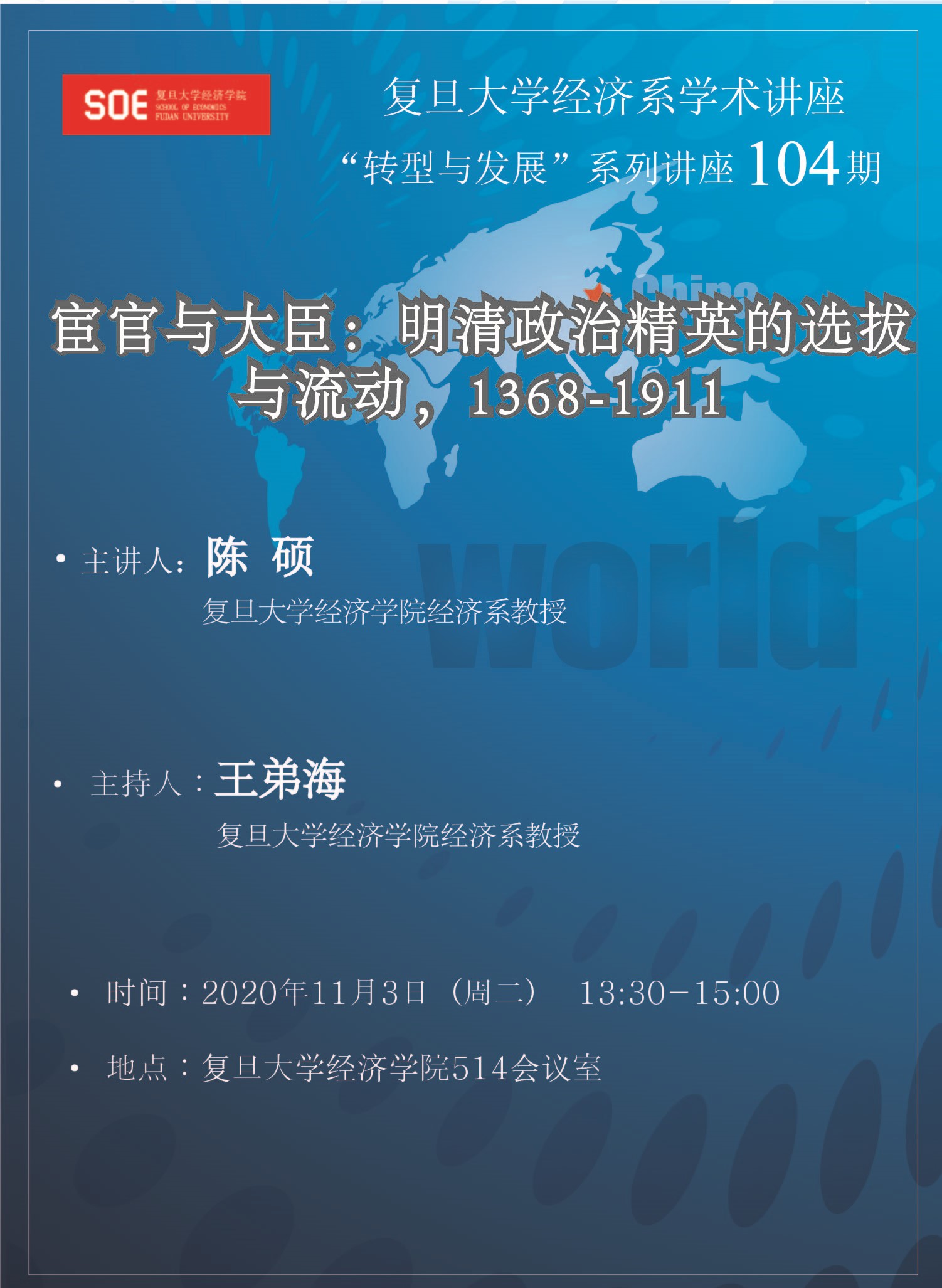 转型与发展经济系列讲座第104期:宦官与大臣:明清政治精英的选拔与流动,1368-1911