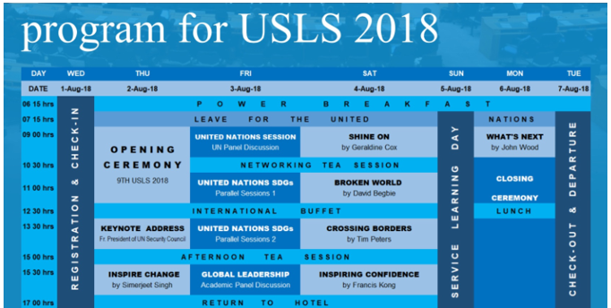 USLS是为来自世界各地的年轻领导者举办的为期一周的关于社会发展的领导力会议,关注新兴国家的领导者促进社会变革,目的在于向新兴国家的领导者灌输社会责任感,培养对边缘化社区的奉献精神。代表们将有机会扩大他们的专业网络并发展对世界事务的理解。