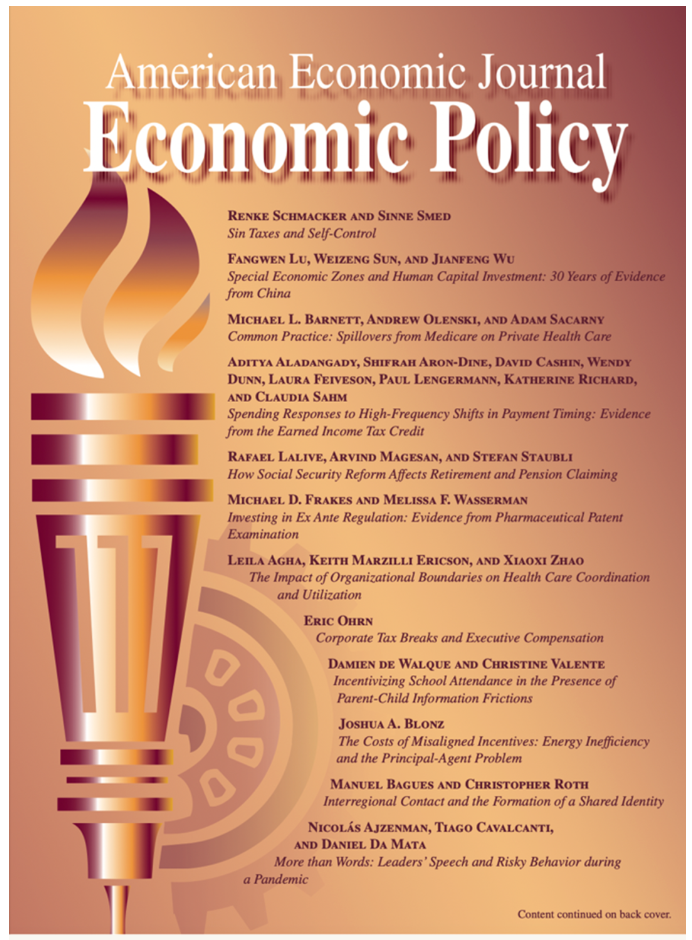 AEJ:Economic Policy是 American Economic Journal 四本子刊之一,其他分别为AEJ:Applied Economics、AEJ:Macroeconomics、和 AEJ:Microeconomics。这四本期刊排名仅次于五大综合顶级期刊(AER, JPE, Econometrica, QJE, RES),在其各自子领域都是公认的Top刊物。AEJ:Economic Policy涵盖一系列主题,领域包括公共经济学;城市和区域经济学;卫生、教育、福利和政治机构的公共政策方面;法律和经济学;经济法规;以及环境和自然资源经济学。