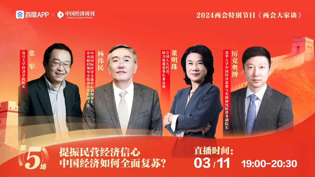 2024年全国两会期间,中国经济周刊联合百度APP,邀请代表委员、学者型官员、商界领袖、经济学家、行业专家,推出《两会大家谈》系列直播,旨在通过专业的探讨,分析现象背后的本质。3月11日的第五场直播关注民营经济话题:今年中国经济的增长目标定为5%左右,要想达到5%左右的经济增速,可能会面临哪些困难,应该如何应对,如何突破经济的内部约束?民营企业家“出海”有何经验可循?新质生产力的提高将对就业和消费产生哪些影响?御书屋