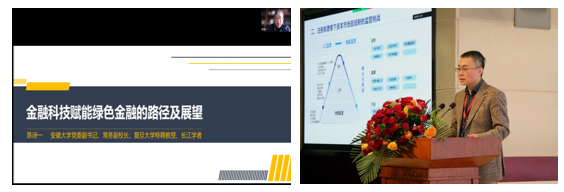 金融研究院秘书长张宗新教授主持了第三部分“绿色技术、绿色金融与智能监管”的主旨演讲。在该主题下,安徽大学党委副书记、常务副校长陈诗一以“金融科技赋能绿色金融的路径和展望”为主题发表演讲。陈诗一教授首先讨论了绿色金融的重要战略意义,并提出了当下以区块链为代表的金融科技手段具有解决跨部门信息隔阂等优势。他认为,未来金融科技在赋能绿色金融方面将有更大作为。最后,陈诗一教授就长三角地区金融科技赋能绿色金融的示范进行了深入总结,并相应提出了几点建议,即长三角地区绿色金融的机构体系和组织体系仍需完善、数据库建设和基础设施建设仍需加强。