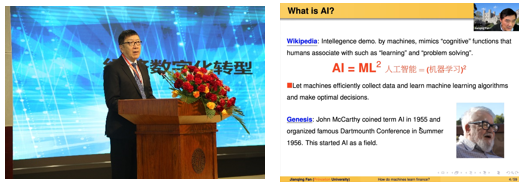 随后,普林斯顿大学Frederick Moore金融教授、COPSS总统奖获得者范剑青教授进行“机器学习在金融中的运用”的主题演讲。结合数字经济的主题,范剑青教授主要从微观角度展开演讲,聚焦于数据科学和机器学习的金融应用两个话题。他认为,多维度无形的大数据给当前的数据分析和统计带来诸多挑战,这也催生了数据收集、数据存储、优势数据计算等新型数据科学,并且正借助于解码原则将大数据转化为智慧数据。在大数据背景下,范剑青教授解释了机器学习在金融领域应用的优势。以金融领域的资产定价为例,他认为资产定价本质是预测问题,机器学习能够捕捉到金融市场数据中的信息,并且学习到的因子具有较强的预测效果。