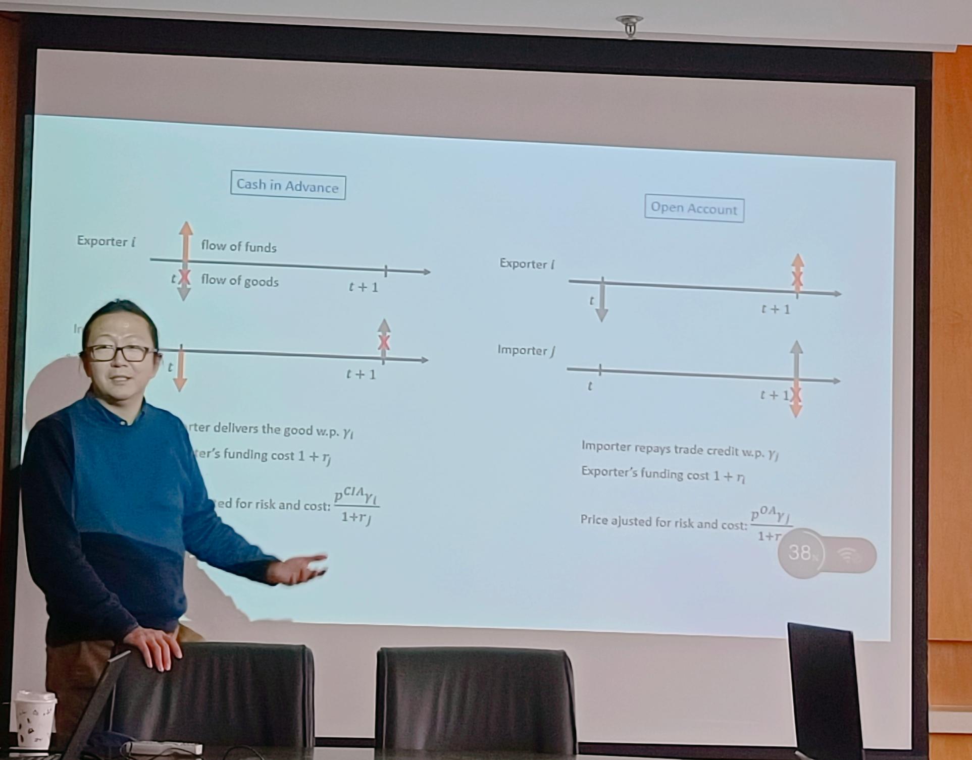 张圣醒教授首先提出研究问题:贸易融资如何促进国际贸易?他介绍了贸易融资的两种主要模式:预付款(cash in advance)和赊账(open accounts)。这两种模式同时也代表了贸易双方分担风险的不同方式。在预付款支付下,进口企业(买方)承担了更多的风险,而赊账方式下,出口企业(卖方)承担了更多的风险。
