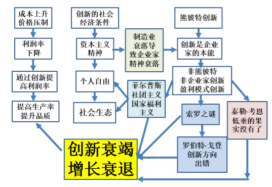 以上从金融干扰的角度解释了创新的不足,经济学家还给出了许多其他解释。一方面,熊彼特创新需要三大条件:(1)资本主义精神。一旦社会过度关注房地产而使制造业衰落,必然引致企业家精神衰落,进而导致熊彼特创新的减少。2.根据菲尔普斯,创新还需要个人自由,但现在西方国家盛行的是社会主义国家福利主义,工会的力量越来越强大,也导致创新的减少。3.需要创新的社会生态,比如硅谷。除此之外,还有三位经济学家从纯技术的角度解释为何西方国家目前仅有的创新不足以推动其经济增长。(1)索罗之谜认为创新走偏了方向。今天的创新并不能够提高生产力,只是被局限在信息技术领域,用来提高速度与容量(比如手机3G到5G的变革)。(2)西北大学教授罗伯特·戈登完全支持这一观点,如今计算机越来越多,芯片功能越来越强大,但只带来游戏与微信支付而带不来真正意义上的技术进步。(3)泰勒考恩则认为,创新对于技术进步的推动开始变少是因为“低垂的果实没有了”,人类进入科技荒原。