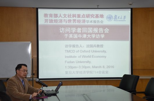 世界经济研究所副所长沈国兵教授做有关牛津访学和“The Effect of a Weakening US Dollar Adjustment on the Technology Structure of China’s Product Trade with the US, 2002-2013”的学术报告。