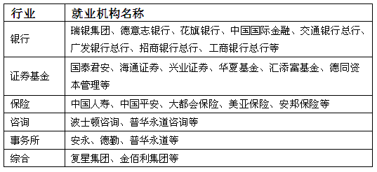 专业学位毕业生就业去向保持了国际化、多元化、专业化的特点,就业行业包括银行、证券、保险、基金、资产管理、四大、信托、咨询等。全部同学均将加入核心岗位,成为有关行业、机构发展创新的重要新生力量。