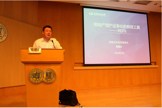 杨德红董事长演讲题目为《房地产资产证券化的有效工具——REITs》。杨董事长首先简单介绍REITs的基本概念、收益来源及与房地产信托的异同,并以美国铁狮门集团为例,说明REITs作为有效房地产融资工具的重要价值。另外,还详细介绍了REITs的成功发展经验、投资特点及地产市场第三方评估体系建设的重要性。演讲结束后,营员踊跃提问,杨董事长就有关问题做了详细解答。