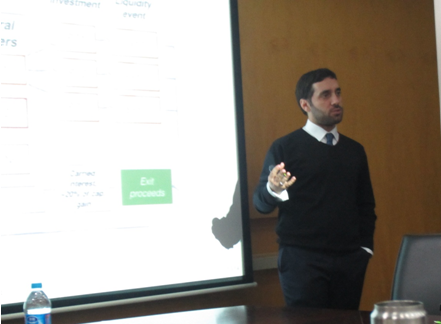 Yan Alperovych教授在讲座中首先用生动的图示为同学们讲解了风险投资的周期特征,并着重解释了投资参与者中有限责任股东及普通合伙人的含义及区别。Yan Alperovych教授从来源、类型、作用等方面对