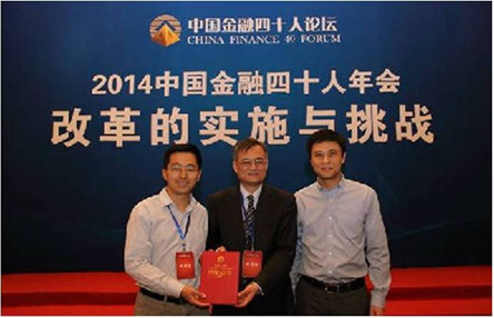 在2013年CF40相关书系及相关成员出版的共计68本书籍中,根据学术水平、政策价值和金融业界影响力三项评选标准,经CF40青年论坛召集人会议讨论和论坛学术委员会的匿名投票,由伍戈合著的《成本冲击、通胀容忍度与宏观政策》共3本书籍最终入选2013年“CF40年度金融书籍”。论坛学术委员会主席、清华大学经管学院院长钱颖一为作者颁奖并合影留念。