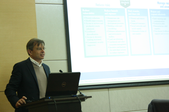 魏希霆先生结合国际最新的灾害管理体系,给同学们重点介绍了两种管理方法。Country/City risk management(CRM)和All-hazards policy framework。前者强调大量政府或私人数据的整合,不是建立固定政策模式,而是建立在随机微弱联系之上,并用美国、加拿大、日本、新加坡的案例进行实例分析。后者通过风险矩阵的形式来合理定量风险及其实施措施原则。