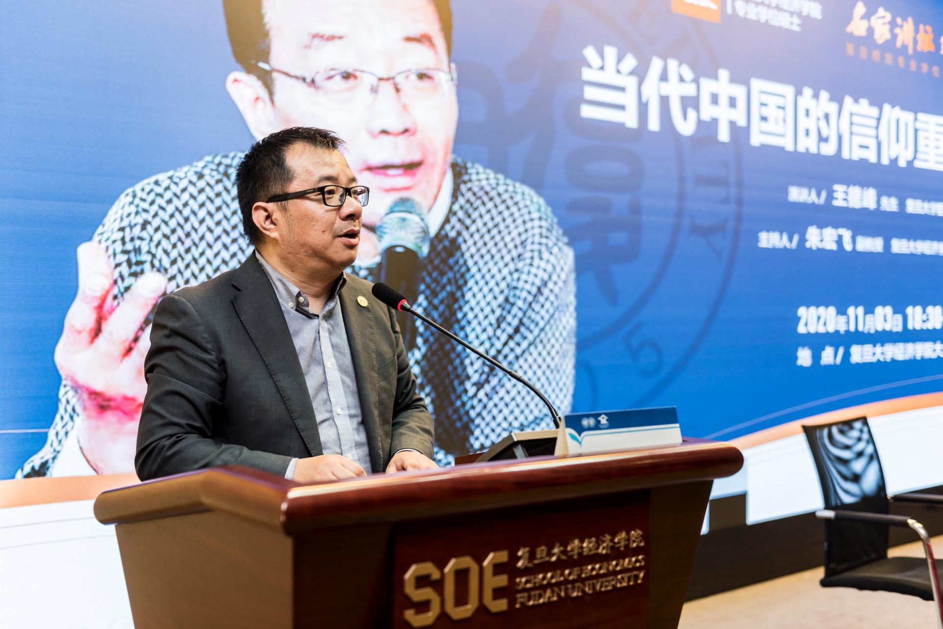王德峰教授的报告分别从“当今世界格局和中国在世界中的位置”、“从西方化促进现代化这一阶段转向现代化促进非西方化的新阶段”、“现代化的历史进程已把中国人推到了重建精神家园的新时代”等方面为同学们阐述了中国信仰的根源、发展与现状。