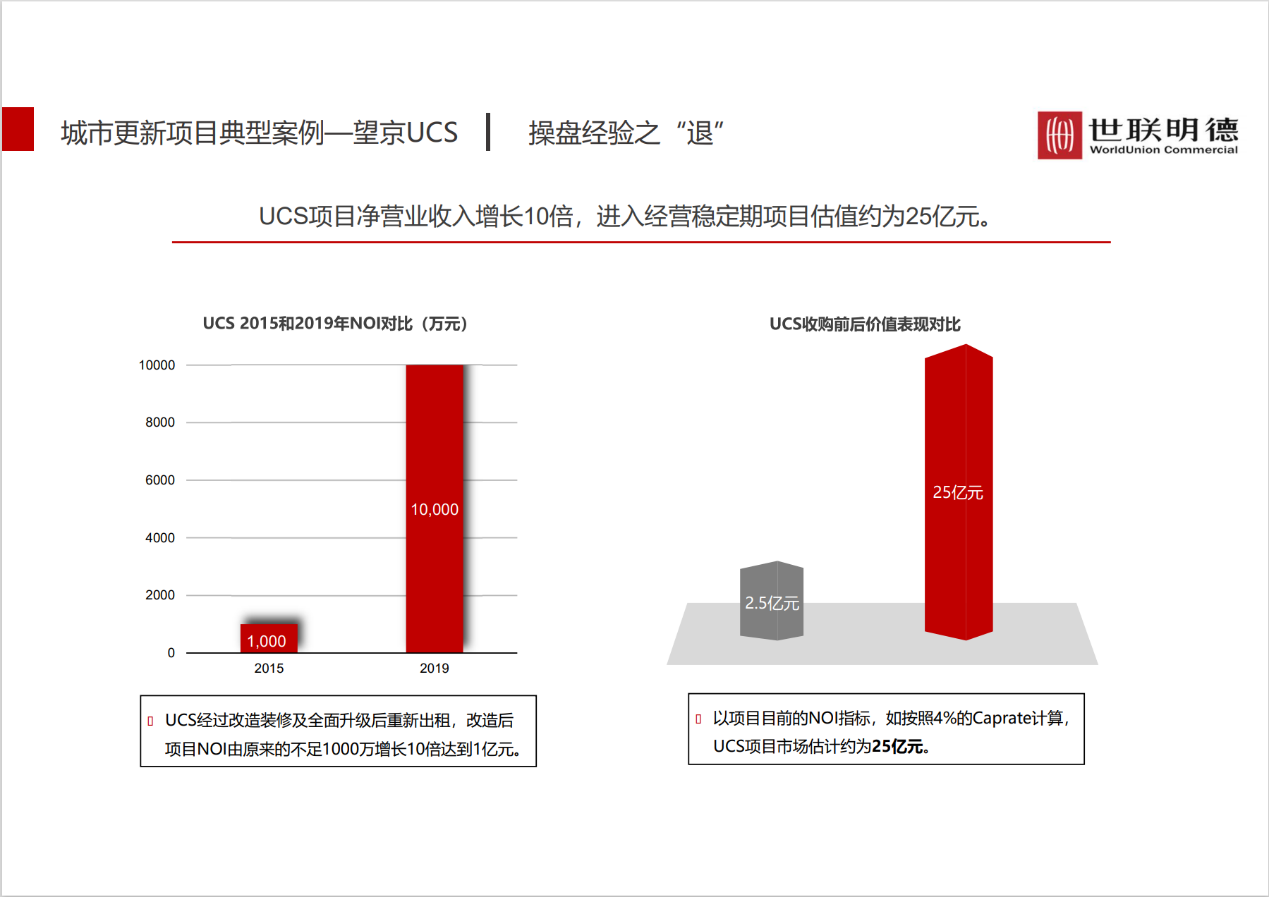 写字楼的退出是回笼资金的过程。按照写字楼交易面积的不同,写字楼退出策略可以分为整售、散售两类,而根据写字楼交易路径的不同,退出策略又可以有资产方式、股权等方式。散售是SOHO的典型策略,其优势在于卖出时间较快、价格较高,但这种方式将写字楼的面积进行分割,导致每一部分单独出租,由于小面积租客不是优质客户,因而写字楼品质难以提高,且鉴于小租客预算有限,租金难以提高。目前大部分写字楼的退出策略为整售,这样可以保证物业品质,但成交周期往往较长。此外,写字楼投资还可以通过资产证券化这一创新性方式实现退出。