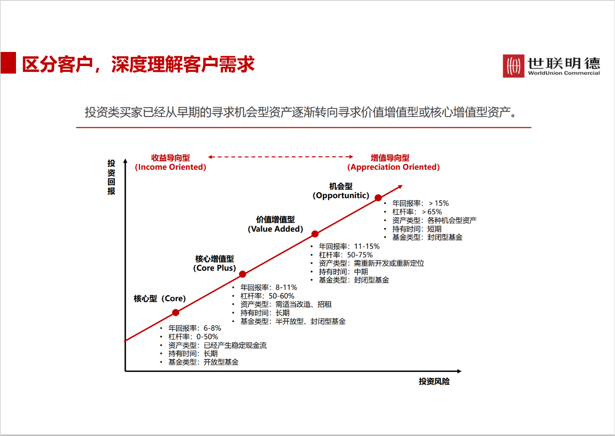 根据商业实质,能通过商业经营为投资人提供收益的不动产都属于商业不动产的范畴。商业不动产的领域涉及写字楼、商业、公寓、会展等,不包括公共服务类建筑,如学校、医院。孟老师以写字楼为例,对商业房地产进行深入的讲解。写字楼与住宅有着本质区别:写字楼属于生产资料;而住宅是生活资料。因此,写字楼的定价偏理性化,写字楼租金与租房企业的管理费用紧密相关;而住宅的决策更加感性,良好的场景描述和体验可以有效提升消费者对产品的价值认同。