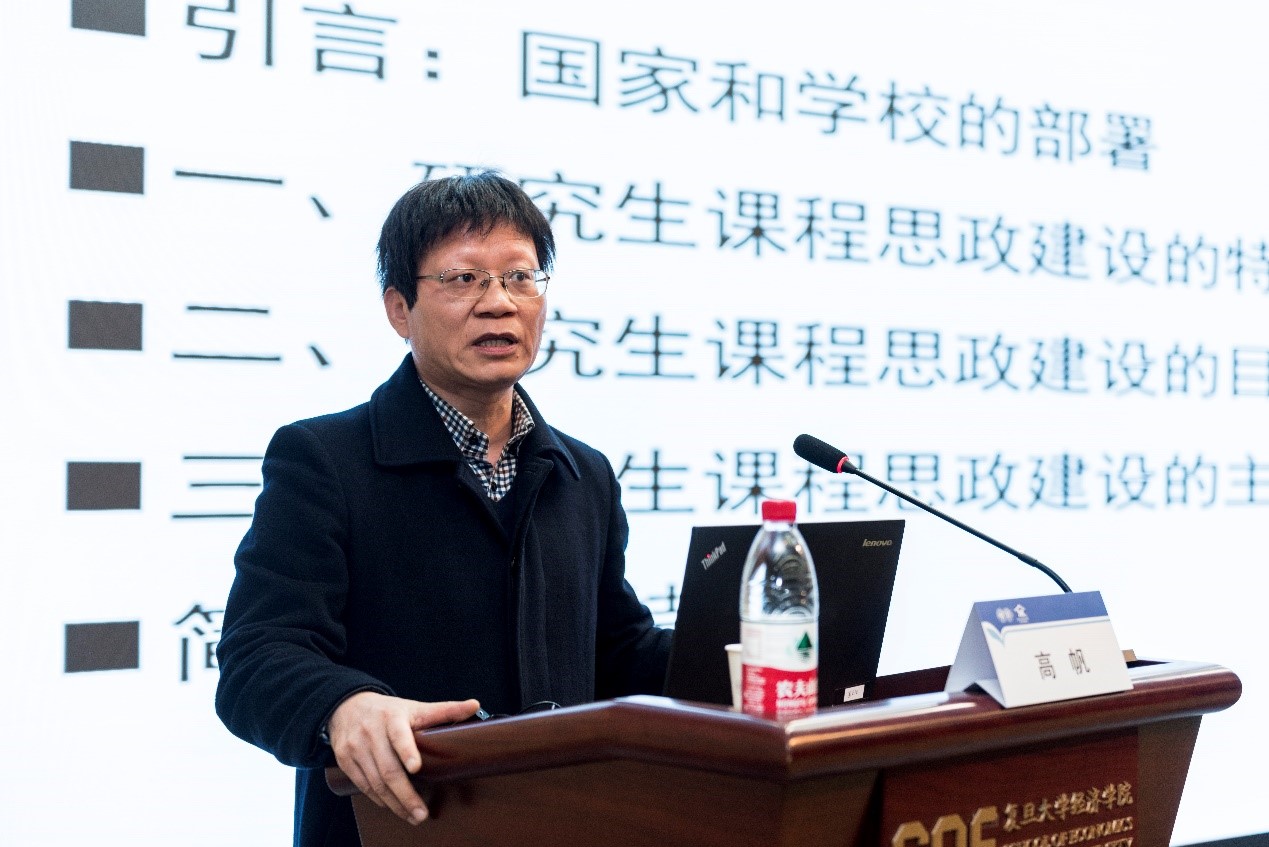 研究生院副院长高帆教授首先传达了国家与学校对研究生教育课程思政建设工作的部署精神,并就研究生培养中课程思政的特定背景、目标定位与主要路径做了详细解读。