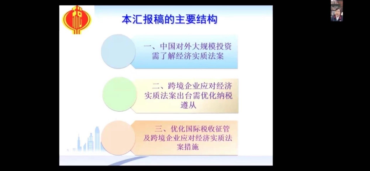 下半场的第一位演讲嘉宾是原上海市国家税务局税收科学研究所副所长金亚萍女士,她分享的主题是“经济实质法案对纳税遵从和税收征管的影响”,金女士介绍了中国对外大规模投资和开曼群岛等传统避税天堂在BEPS项目的影响下陆续引入经济实质法案的背景,指出中资企业现有的离岸架构受到严峻挑战,应注重前瞻性地选择备选方案,同时就税务机关而言,也要做出必要的调整,注意处理好相关的税收情报交换等征管问题。