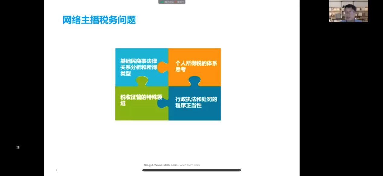 随后上半场的主题演讲正式开始。第一位演讲嘉宾是金杜律师事务所合伙人叶永青先生,他分享的主题是“劳务报酬与经营所得——以网络直播为例”。叶永青先生以近年来明星及网络主播偷逃税案为背景,从基础民商事法律关系、个人所得税的体系、税收征管特殊性以及行政执法和处罚的程序正当性等不同角度分析了劳务报酬和经营所得的区别及其识别中应注意的问题。叶先生认为劳务报酬与经营所得的最重要的差异在于前者的取得除了劳动力的付出之外,不附加产生大量的经营成本,他强调了回到业务实质和基本民商事法律关系去深入思考相关应税行为的重要性,同时也指出,税案信息披露的透明性有助于公众更好理解相关逃避税行为被认定的原因。