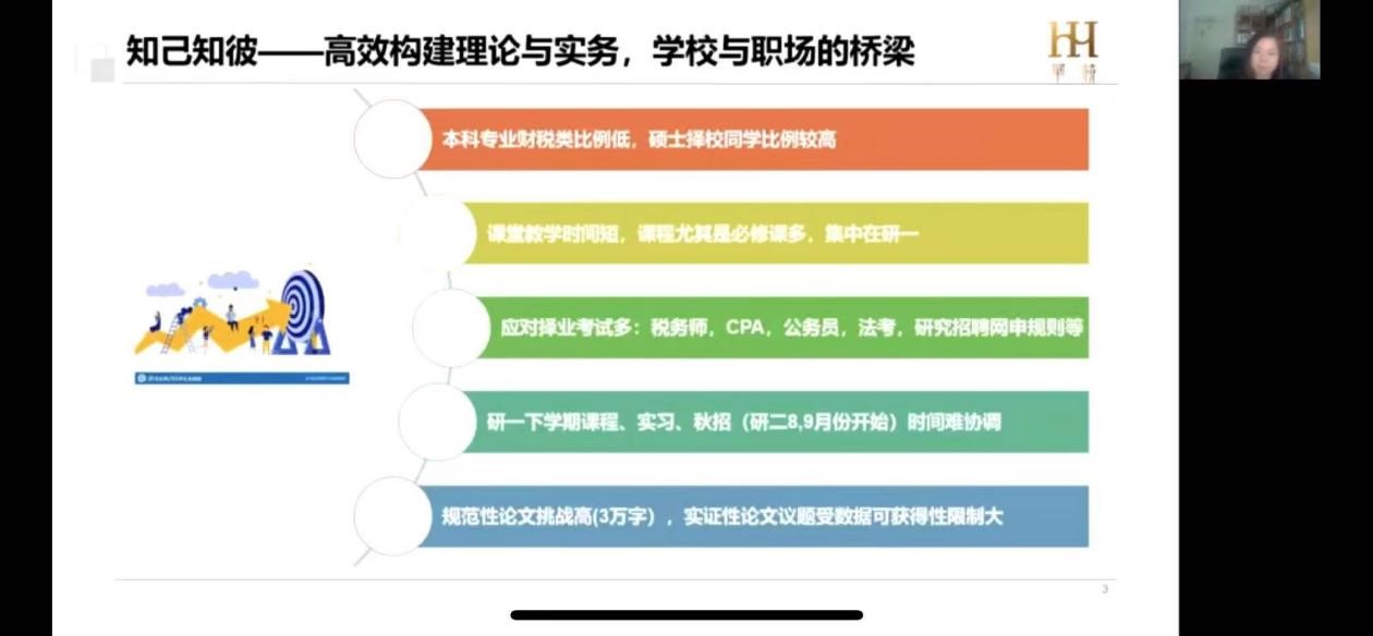 接着,华赫集团副总裁、华赫研究院执行院长王珲女士分享了她对于税务专硕研究生培养的思考与实践经验,她认为税务专硕阶段的学习需要帮助同学们要高效构建起理论与实务、学校与职场的桥梁,同学们要兼顾学业课程、实习和毕业论文,不仅要具备税务核心技能,还要培养自身业务见解与商业头脑、人际技能与领导技能。王珲女士阐述了自己以能力的锻造为导向来设计课程的思路,以及如何帮助同学们解决最迫切的问题,例如,论文写作中如何锻炼研究能力、积极主动寻求校内外导师指导把关,择业中如何把握时代的趋势找到热爱与擅长,等等,她的分享使参与活动的师生们都深受启发。