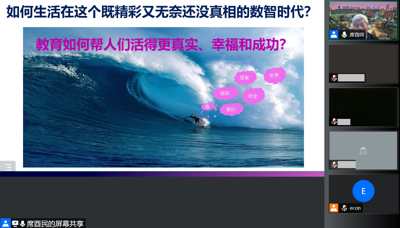 本次讲座的主要内容包括数智时代应该以怎样的心智生存,教育如何对塑造人的心智和思维境界起作用,以及当前的教育应当如何转变、重塑,才能使大家获取到真正有利于提高个人能力和精神境界的能量。