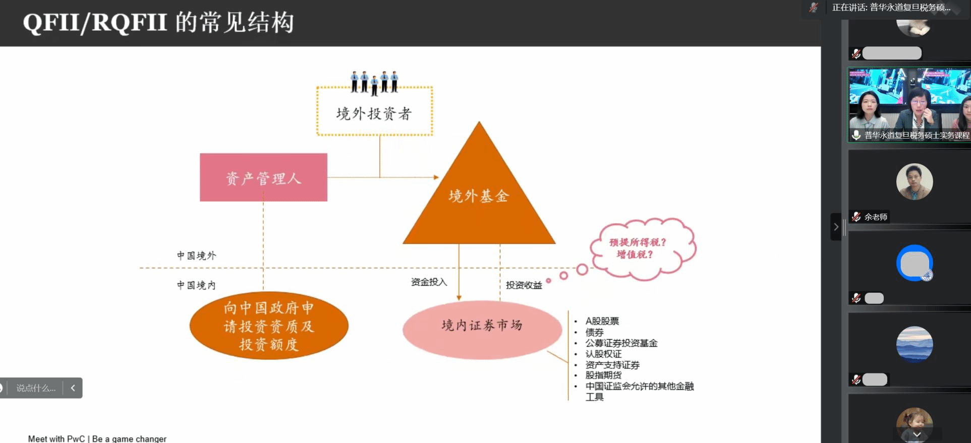 其次,马老师分享了金融税务项目组的架构和工作内容,如金融税务项目咨询等。为了让同学们对税务工作有更深刻的了解,马老师从如何合规地最小化税收成本拆解VIE架构开始,详细介绍了合格境内机构投资者(QDII)的常见结构及其税务影响。中国境内投资者想要进入境外证券市场进行投资时,可以通过境内的基金产品、理财产品进行间接的投资。对于中国投资者从中获得投资收益的相关税务问题,马老师也进行了详细讲解。此外,马老师还具体介绍了合格境外机构投资者(DFII)、人民币私募股权投资基金和美元基金的常见架构、税务影响以及普华永道税务部门在其中起到的作用。马老师对国外常见的家族信托涉税问题也进行了基本框架的梳理和相应税务问题的分析。
