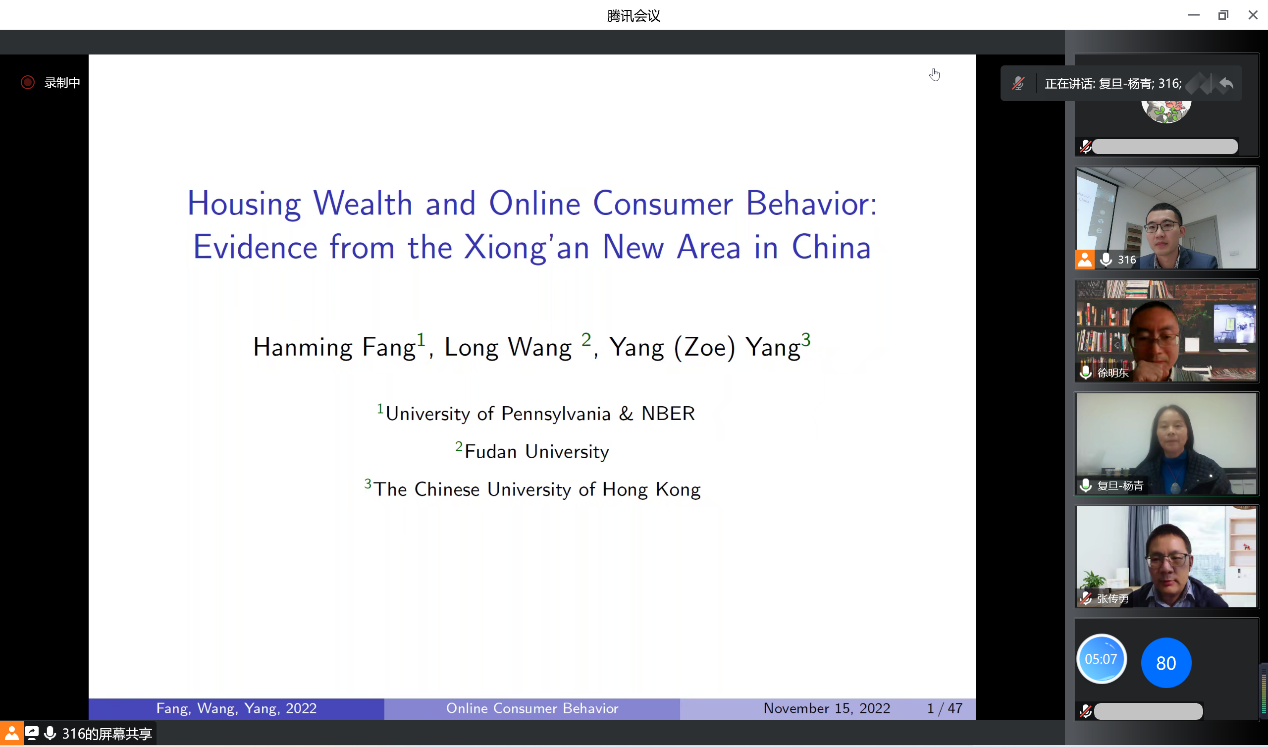 助理教授王龙老师带来了主题为“房产财富和消费行为:来自中国雄安新区的证据”的分享,本次讲座由御书屋