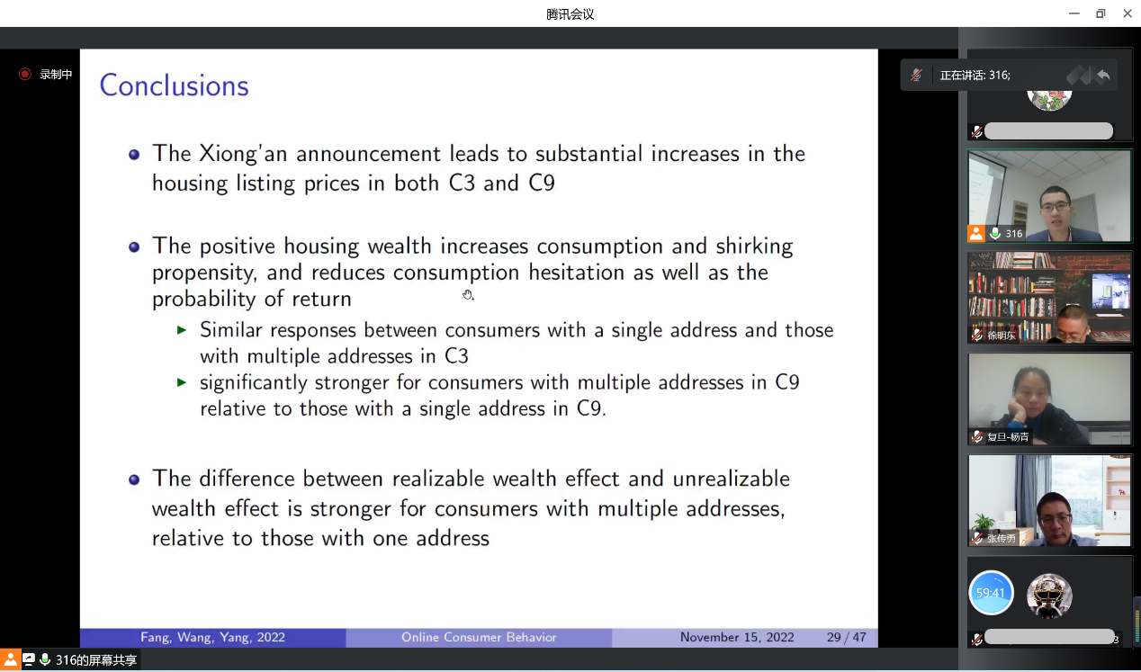 王老师分享的文章题为《房产财富和消费行为:来自中国雄安新区的证据》,他首先介绍了该领域现有文献的关注点和研究空白。房产作为家庭财富的主要来源,其对消费的影响一直是学界关注的热点。现有文献对消费量的研究已经较为透彻,但对购买冲动、付款犹豫、下单时间等消费行为的影响仍存在较大空白。这篇文章聚焦于线上消费行为,构建了消费行为的衡量指标,清晰地识别了可变现和不可变现的房产财富对消费行为影响的差异,并对影响机制进行了详细解释。