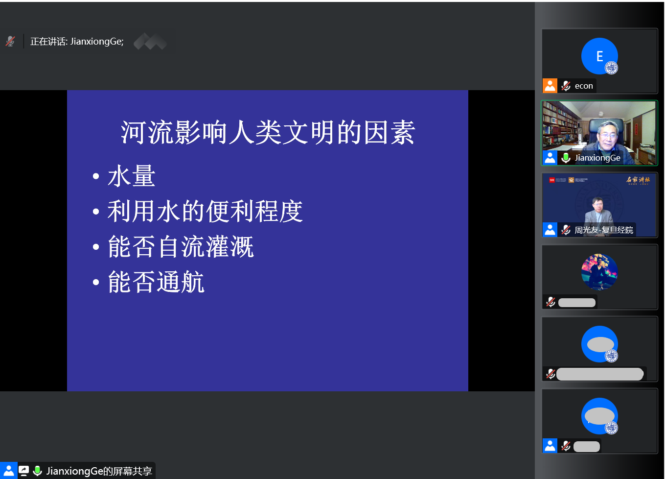 接着,葛老师对与河流有关、又与人类文明关系最密切,且最重要、甚至起决定性作用的因素进行了分析。一是河流的水量,若想孕育出重大文明,那么河流一定是大水量,且水量不受季节限制;二是利用水的便利程度,例如中国古代杰出的水利工程都江堰就是便捷用水的典型例子;三是能否自流灌溉,例如尼罗河不仅可以自流灌溉,泛滥后还可以造成淤泥,形成天然的肥沃土壤,是十分有利的条件;四是能否通航,例如我国的长江、欧洲的莱茵河等,现在的水运都相当发达,也成为了对沿线国家和地区发展非常有利的因素;五是流域的气候,其中最有益的是温带气候,此外,地中海气候在冬天湿润多雨的特性也有利于植物越冬,也是很有益的气候类型;六是流域小气候,一般而言,江河的中下游气候比较适宜;七是河流的流向以及水文特征,一般而言,东西向的河流总的来说流速相对快,水流比较畅通,但也需要具体情况具体分析;八是流域的地形、地貌,例如长江和黄河的共同特点在于,流域本身是从高原一路降低,落差都有四千多米,这样的地形形成的水能较大;九是土地等初级资源,以及植物资源、动物资源,这些资源的丰富也有利于人类分工专业化;十是河口的位置,例如尼罗河的河口在地中海,所以埃及人可以跨海与罗马人、希腊人、爱琴海人等打交道;十一是与其他大河间的距离,这也是决定一个文明会不会被其他文明影响的重要因素,例如黄河、长江与其他大江大河的距离相对较远,中华文明在很长时间内就没有受到其他重大文明的影响。