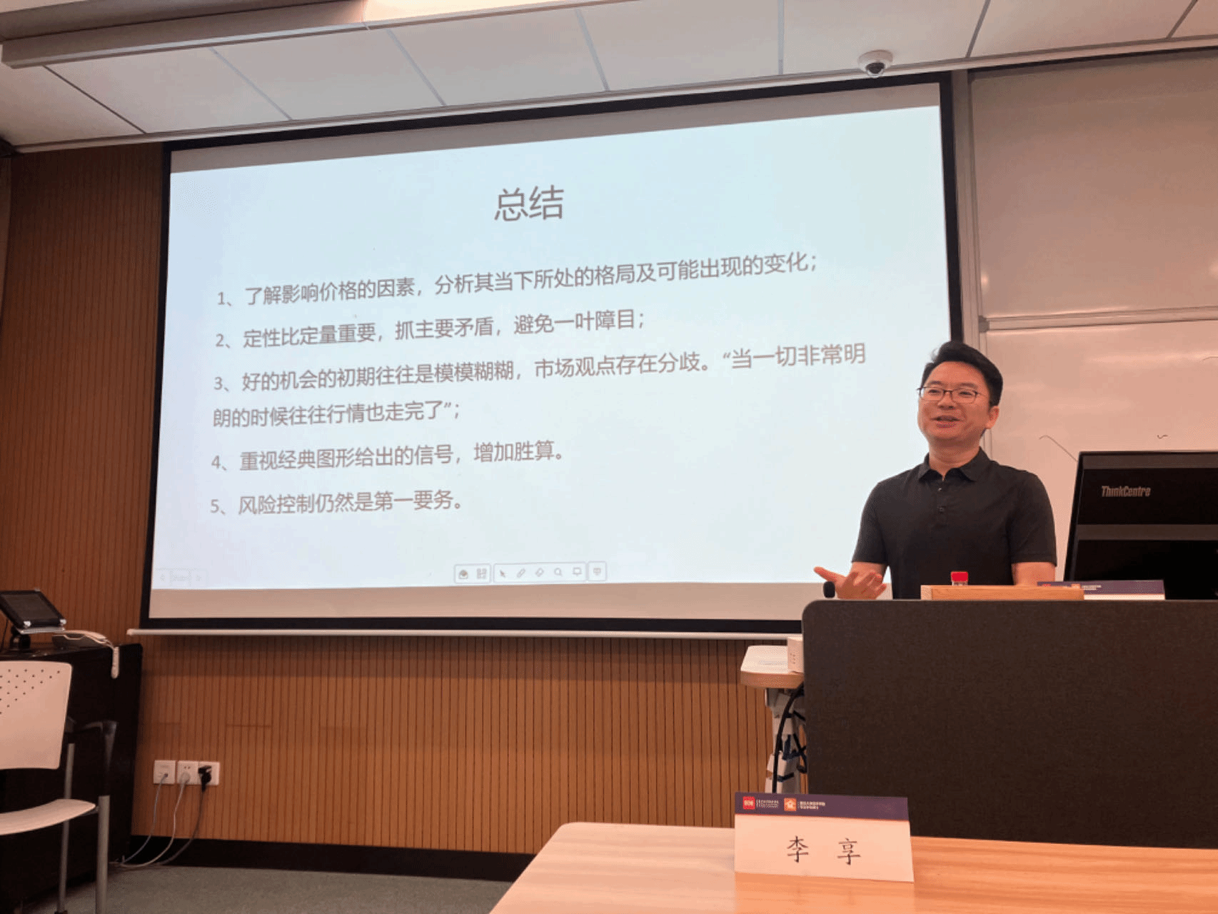 最后,李老师总结了他从这些经历之中收获的经验。一是要了解影响价格的因素,分析当下所处的格局以及可能出现的变化。二是要抓住主要矛盾,避免一叶障目。三是在投资时要重视经典图形给出的信号,也要意识到,好的机会在初期总是模糊的,市场观点会存在分歧。四是要重视风险控制,这始终是保持长久的投资生命的第一要务。在互动环节,李老师与同学们进行了大量的互动和交流,令同学们受益匪浅。