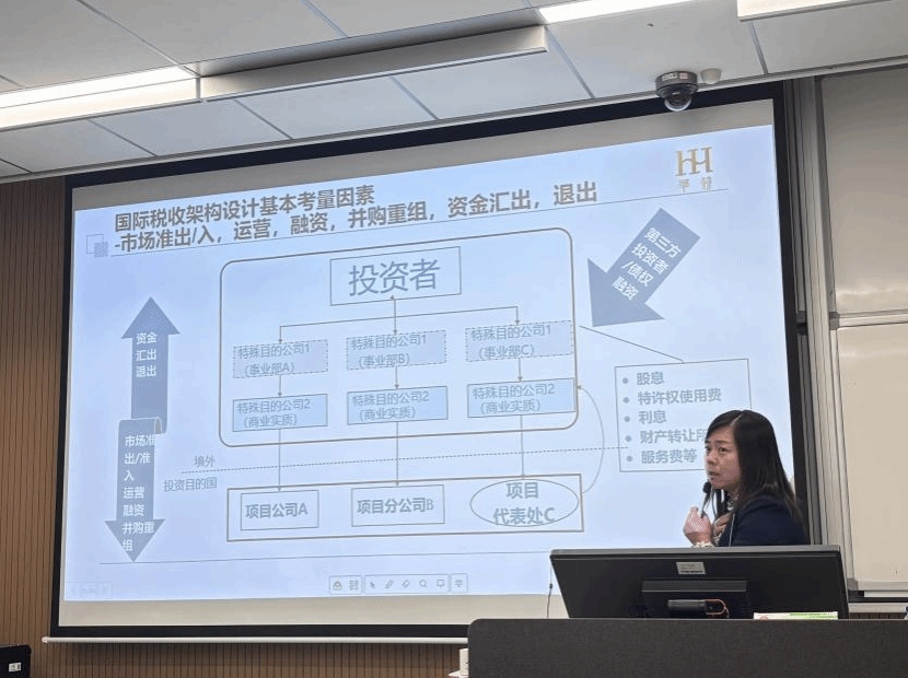 然后,王老师深入剖析了国际税收的核心特点与架构设计逻辑。她对比了OECD与联合国两大税收协定范本的差异,详细解读了“常设机构利润归属”、“受控外国公司(CFC)规则”等专业知识要点;同时结合上海电气EPC合同税务争议、安克创新海外品牌建设税务规划等真实案例,生动阐释了“业财税法融合”的重要性。“企业出海绝非简单的产品输出,而是产业链布局与品牌影响力的全球化延伸。”王老师强调,税务架构设计需统筹多重目标:既要考虑融资便利度与退出灵活性,也要坚守合规安全底线。例如新加坡、中国香港中间控股公司的设置,既要充分利用两地的税收协定优惠降低整体税负,又必须满足“商业实质”要求,避免触碰反国际避税规则红线。