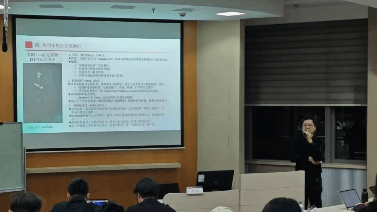 其次,在家族办公室分类与典型案例部分,张举先生详细介绍了单一家族办公室、联合家族办公室及虚拟家族办公室的差异,并通过多个国内外经典案例分析来深化学子们对其理解。在国外案例分析中,他阐释了洛克菲勒家族办公室历经百年传承、管理规模超千亿美金的治理架构与投资理念,也探讨了比尔・盖茨通过Cascade投资公司与盖茨基金会实现财富增值与社会价值的双轨模式。在国内案例分析中,他比较了马云旗下蓝池基金、龙湖吴亚军旗下双湖资本等,分析其资产配置策略、组织运营特点及风险隔离作用,尤其强调了吴亚军家族办公室在房地产行业调整期帮助龙湖集团避免了房地产行业的系统性风险的巨大价值。