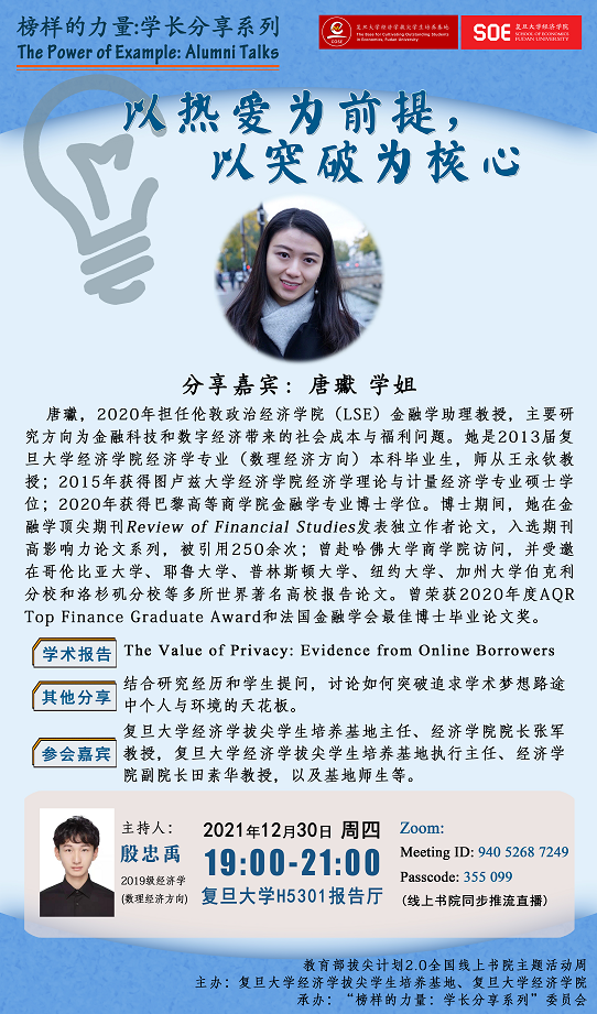 经济学专业(数理经济方向)本科毕业生唐瓛学姐,向同学们分享前沿学术报告,以及如何突破追求学术梦想路途中个人与环境的天花板。