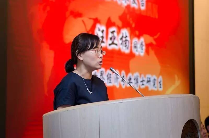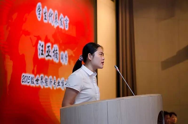 在庄严的国歌奏唱声之后,2015级世界经济专业博士研究生汪亚楠同学作为学生代表发言,汪亚楠同学热爱学术研究,曾先后荣获硕士国家奖学金、博士国家奖学金、2016年首届女性创业大赛三等奖、御书屋
