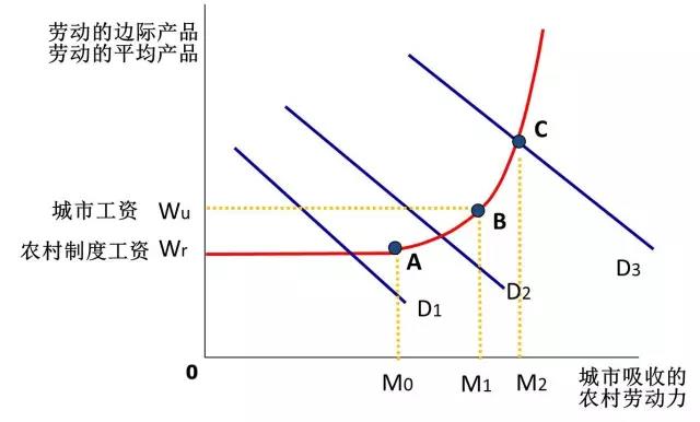 这个图是这样,红色的是农村的劳动供给曲线,黄色的WuB是城市的劳动供给曲线,在实现现代化和城乡一体化之前,这两条线是分叉的。OMo代表农村的剩余劳动力,即劳动边际产品为零的这部分劳动力。由于农村剩余劳动力的存在,传统农业部门一开始可以对现代城市部门提供几乎有无限弹性的劳动力。当农村剩余劳动力被城市部门吸收完毕,就抵达了被称为“刘易斯第一拐点”的A点,此时农村的劳动边际产品开始为正,但还是低于一般的城市劳动工资,所以城市的劳动工资也不需要上升,但是在刘易斯第二拐点B点之后,城乡的劳动市场就统一了,城市跟农村的劳动收入一致了,以后如果再需要劳动,工资就要上升。根据刘易斯拐点理论,在正常的市场经济下,必定在吸收完了剩余产品为零的农村劳动力之后,才接着开始吸收那些边际产品为正,而且越来越高的农村劳动力。但是这跟中国农村留下老弱病残孕、土地平均经营规模并没有变大、劳动生产效率并未显著提高的事实明显不符。