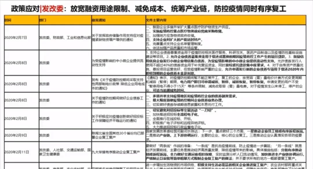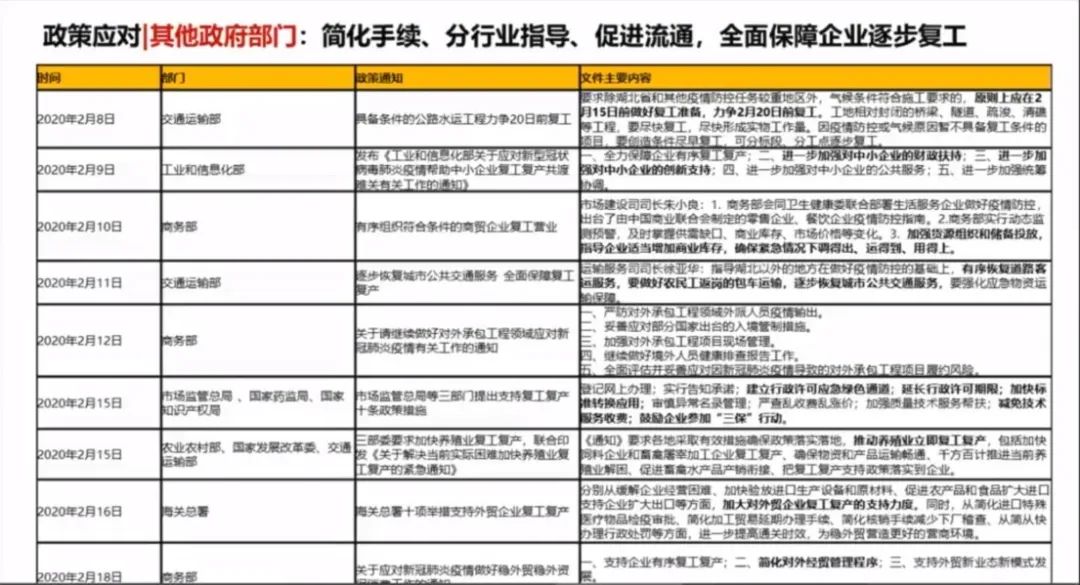 交通部门,针对整个运输方面的政策;工业和信息化部,针对中小企业信息创业支持;商务部,针对商贸企业复工的指导,比如既要存得进又要调得出、用得上,比如对外包项目的管理和安排都做了很多;海关总署,对恢复外贸企业复工复产的支持,都做出了一系列的文件。我们这些文件做了梳理看到,其实都是非常积极的,这个力度也是非常大。