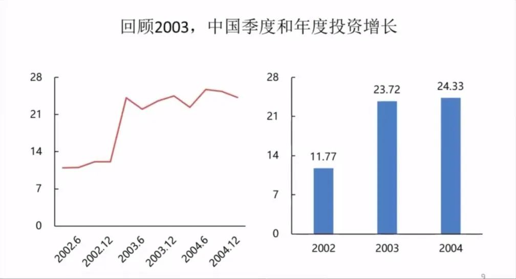 用一些具体的数字来看,可以看到2003年中国季度增长,第二季度有一个短暂的下跌,之后就一直上升,趋势是整体往上走。投资方面,大家可以看到整个的投资一直上升。整个的投资2003年上升了23.72,2004年上升了24.33,所以投资反弹是非常强劲的。