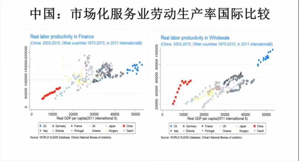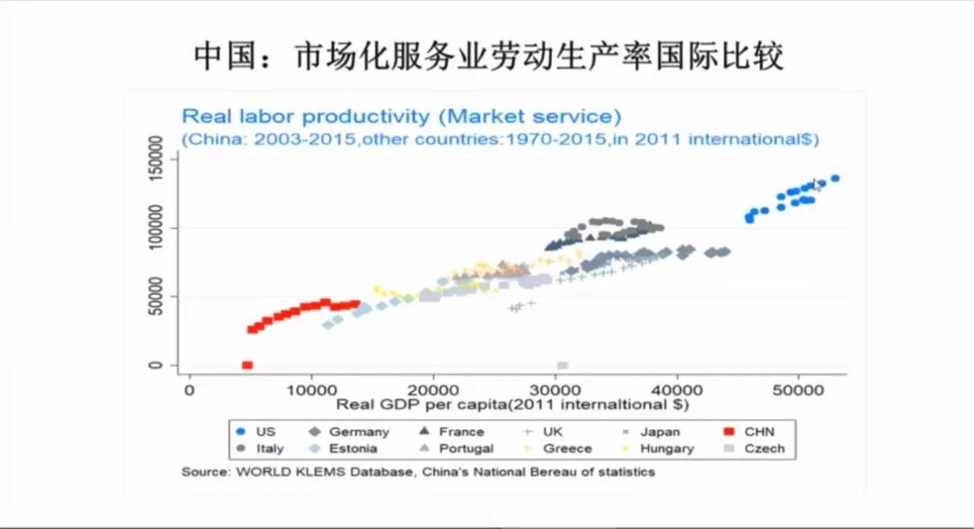 可以看到在中国人均1万美元时,把中国和发达国家走过的轨迹相比,市场化的服务业劳动生产率和国际的基本趋势还是一致的。所以我们的服务业只要有竞争,还是有劳动生产率。