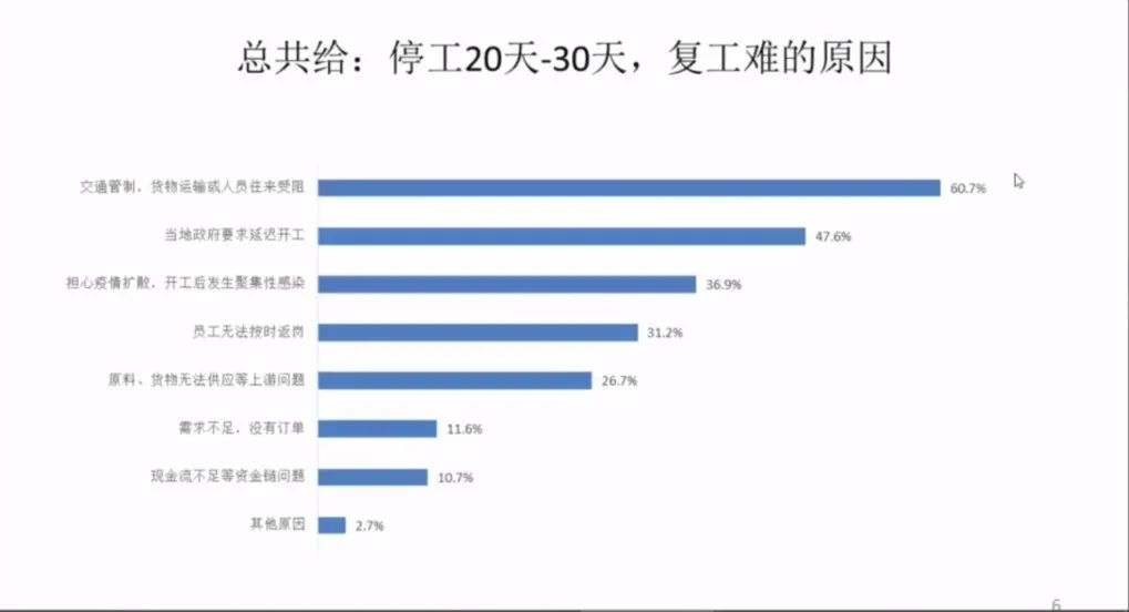 我们做了近万家的企业调研发现,复工难的原因从供给来说还是物流、人流、交通流不通占了60.7%,这是总供给的问题。因为疫情,政府希望延期复工占17.6%,也有36.9%的企业,担心复工以后又产生新的疫情扩散;员工无法按时返岗,占到31.2%。