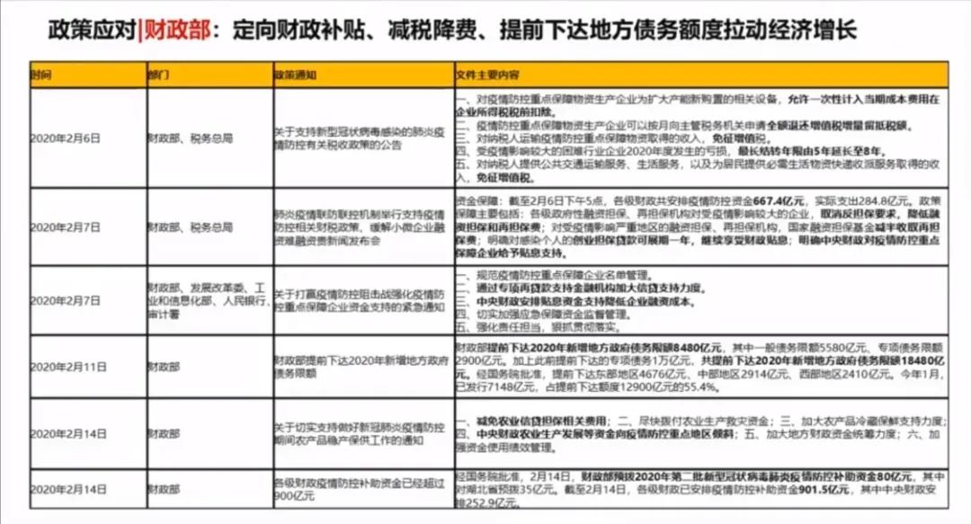 企业所得税的税前扣除,2月6日就做出了一系列的具体的保证;27日,对疫情的政府资金提供了667.4亿的疫情保障资金;对重点的企业给予贴息、补息等多方面的支持;另外,通过专项再贷款,加大金融机构的信贷利润支持等等,所以财政部也出台了一系列的政策。