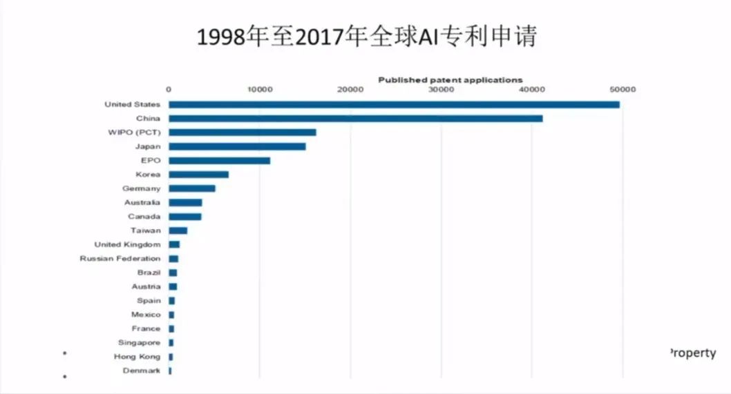 我们把1998年到2017年的全球AI专利的申请,我们做了一个图表,我们可以看到美国还是领先,大概有4万9千例左右,但与中国比,领先优势并不大。中国已经占到了4万2千例不到,离美国也就差一点点。所以,中国的专利研究和专利水平已经在走上世界水平。