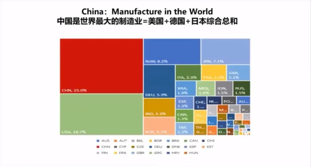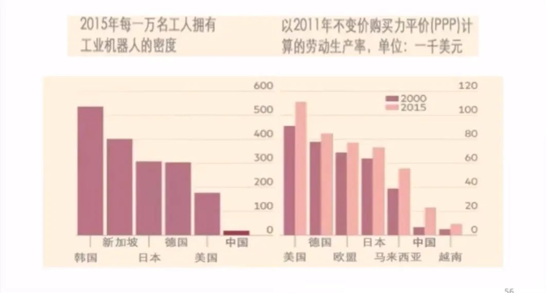 制造业,中国是世界上最大的制造业大国,中国的制造业等于德国、美国和日本的总和,但是中国制造业的机器人比例是很低的。