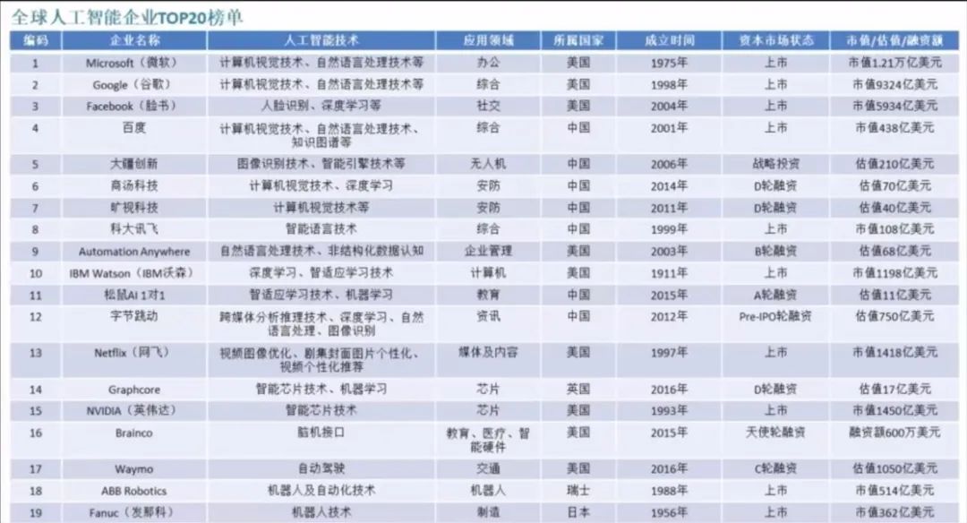 最近发布了全球人工智能企业的前20家的排名。大家可以看到,在20家的排名里,美国是8家,包括微软、谷歌。中国是7家,包括百度、大疆、商汤、旷视、科大讯飞、字节跳动等等。