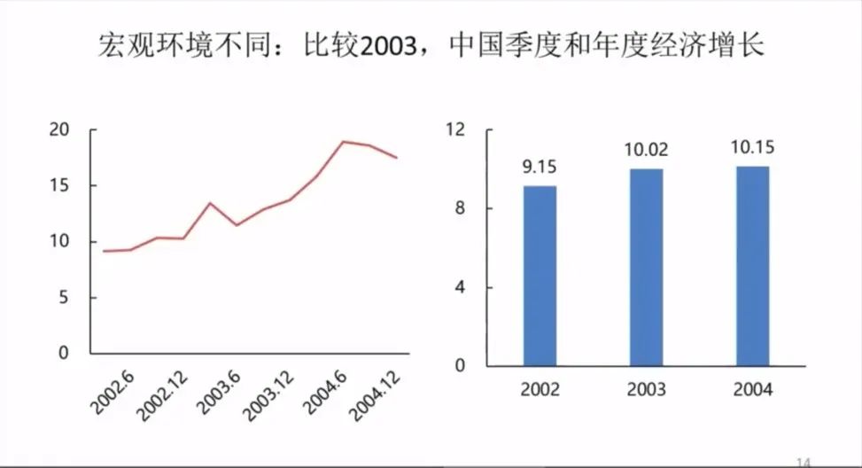2.2003年处于全球性的上升周期,中国也是在上升周期中。所以,2003年非典期间,中国政府启动政策后能够有一个非常迅速的经济反弹。然而,在今天环境下,这个会变得相对比较困难一些,整个的周期是不一样。