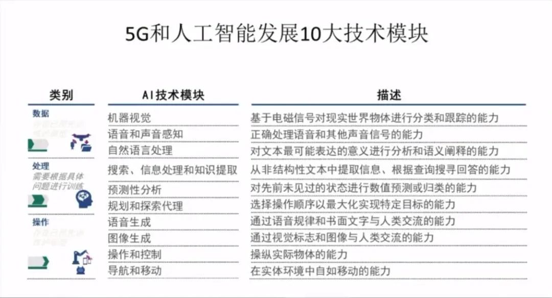 第一类数据模块,包括机器视觉、语音和声音感知、自然语言处理,现在走得很快。第二类处理模块,包括搜索、信息处理和知识提取,预测性分析,规划和探索代理。第二类操作模块,包括语音生成、图像生成、操作和控制、导航和移动。