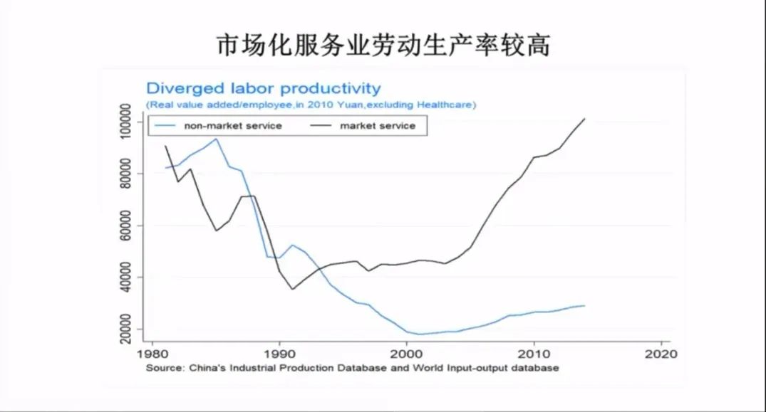 我们发现服务业市场化的劳动生产率上升还是很高的,非市场化的服务业劳动生产率不高。所以提高服务业劳动生产率,进一步演变成怎么样提高非市场化劳动生产率。