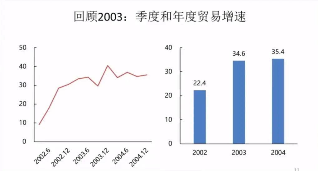 2003年的贸易方面,大家可以看到,一个季度的下跌以后,就开始反弹,之后维持上升,所以全年的贸易增长速度从2002年的22.4上升到上2003年的34.6,再上升到2004年的35.4,所以说,贸易的反弹也是非常的强劲。