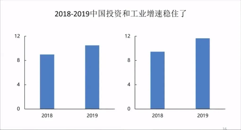 但是好在是2018年到2019年期间,我们的投资和工业是稳住的,我们的投资2018年的增长是23.7%,2019年达到了24%。2019年政府做了大量的工作,减税、鼓励投资、宏观政策和货币政策支持。2018年的工业增速也稳住了,从整个10%左右上升到11.5%左右。这方面有了一个很好的基点后,可以继续的反弹。
